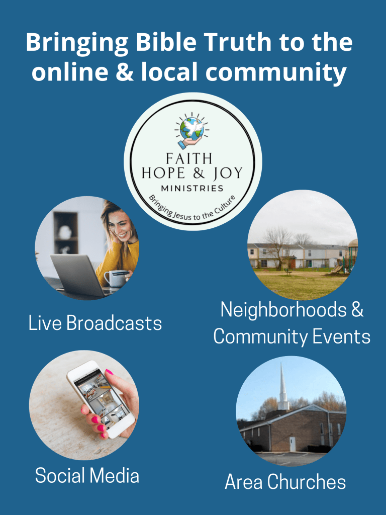 Faith, Hope, & Joy Ministries not only reaches out into the local and online community but also equips the church to reach out into their local community. The church is not a building. The church is a people.